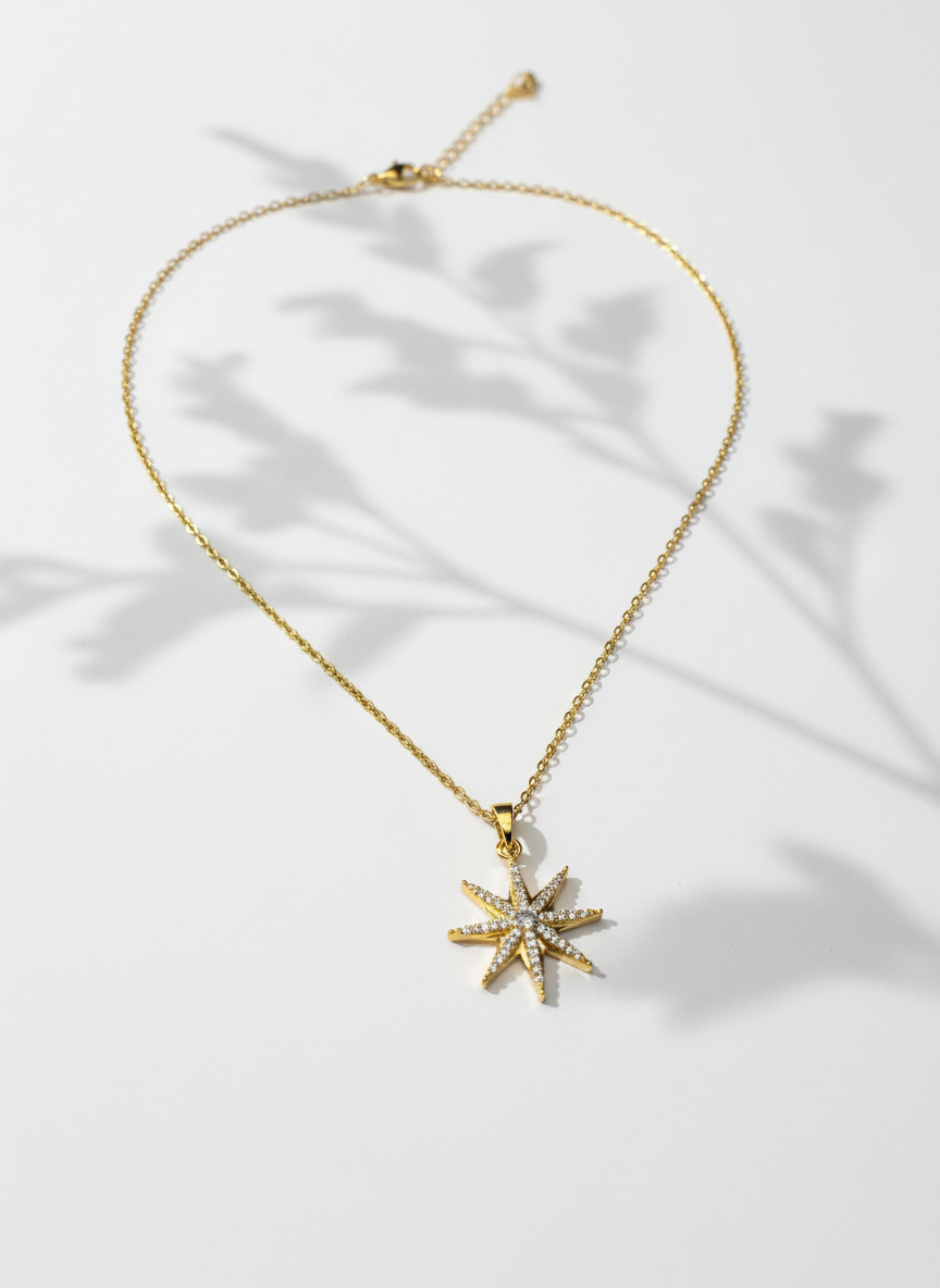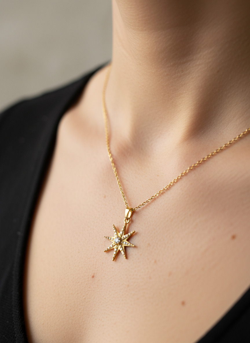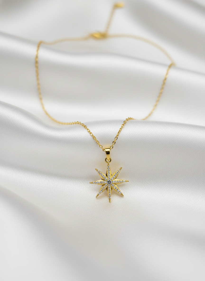 Gökyüzünün en parlak ve yol gösterici yıldızı olan Kutup Yıldızı bu zarif tasarımda boynunuzu süslüyor.